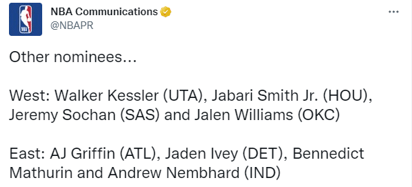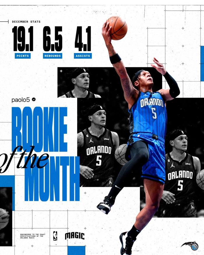 魔术状元班凯罗场均拿到19.1分6.5篮板4.1助攻,单月10场比赛超过20+,夺得东部月最佳新秀;魔术官方发推祝贺班凯罗。