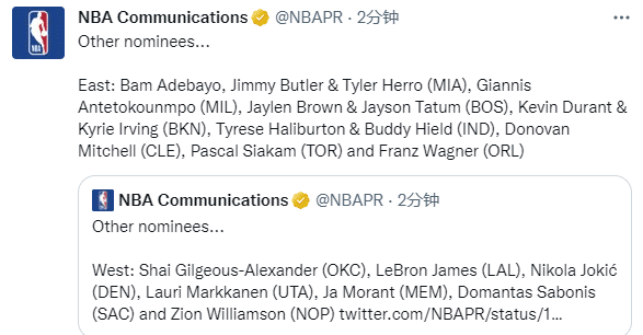 东部——阿德巴约、巴特勒、希罗、字母哥、杰伦-布朗、塔图姆、杜兰特、欧文、哈利伯顿、希尔德、米切尔、西亚卡姆和魔术瓦格纳