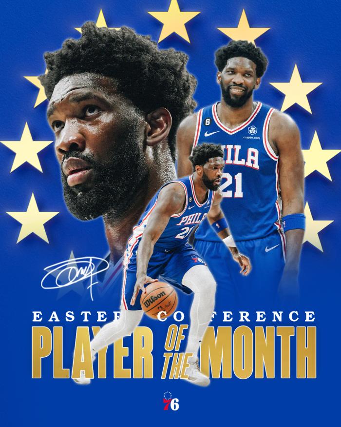 76人官方第一时间祝贺恩比德获月最佳大奖。