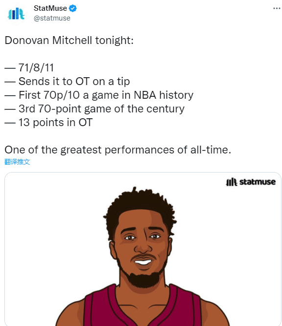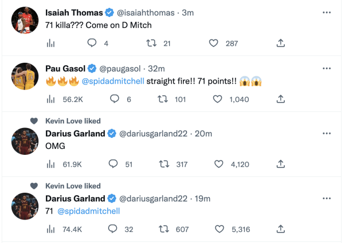 加兰发推高呼:我的天呐,米切尔狂砍71分;湖人名宿大加索尔直言米切尔71分太火爆了;小托马斯发推:71分杀手;尼克杨直言你们应该像吹东契奇那样吹米切尔。