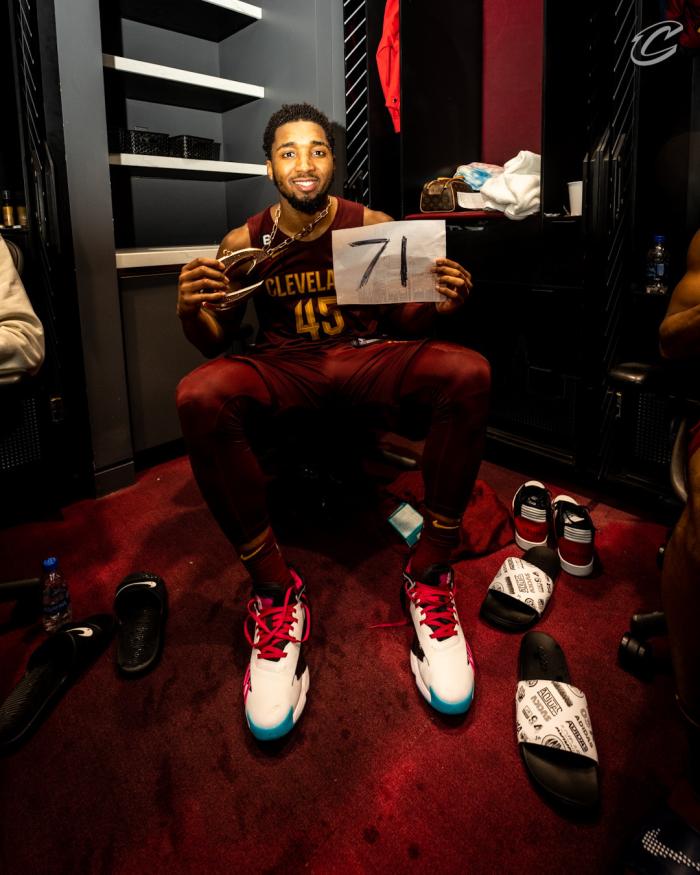 骑士赢球赛后,他们在更衣室疯狂庆祝,全队为米切尔疯狂泼水庆祝,米切尔获得本场最佳金链子;全队合影留念,米切尔手持写着71分的A4纸,早已笑得合不拢嘴,合影时米切尔站在C位。