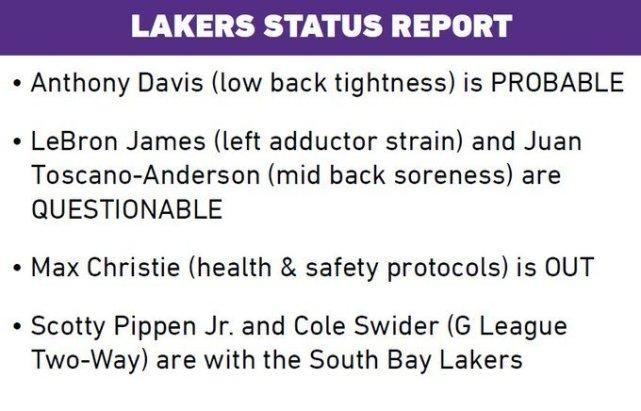 来源:24直播网11-20 19:3624直播网讯11月20日,湖人官方公布了最新的伤病报告,詹姆斯(左内收肌拉伤)和托斯卡诺-安德森(背部酸痛)的状态同为出战成疑(questionable,50%上场可能),浓眉(腰部紧张)的状态是大概率出战(probable,75%上场可能)。克里斯蒂触发健康安全协议,继续休战。小皮蓬和斯维德仍在G联赛的南湾湖人效力。