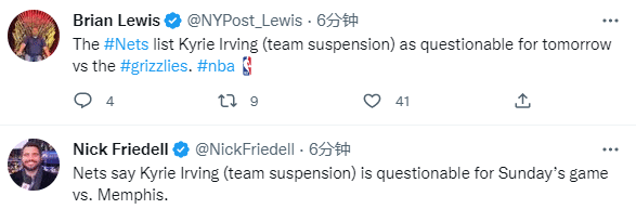 由于被球队禁赛,欧文已经连续缺席8场比赛,下一场对阵灰熊,欧文的出战状态被升级为出战成疑,50%可能性出战,这是欧文被禁赛后首次被列为可能出战,这意味着欧文已经获准归队。