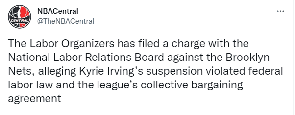据美媒报道,一个名为“劳工组织者”的独立活动组织已向美国劳动关系委员会(NLRB)就欧文被停赛事件向篮网提出了指控,称篮网对欧文的停赛决定违反了美国联邦劳动法和联盟劳资协议。