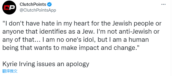 今天欧文再次公开道歉,表示:我的心里对犹太人没有任何仇恨。我不是反犹主义者,和亲人坐在家里的这段时间很艰难;我不只是向犹太人道歉,还要向我的家人以及亲朋好友道歉,我为自己的所有行为深表歉意。