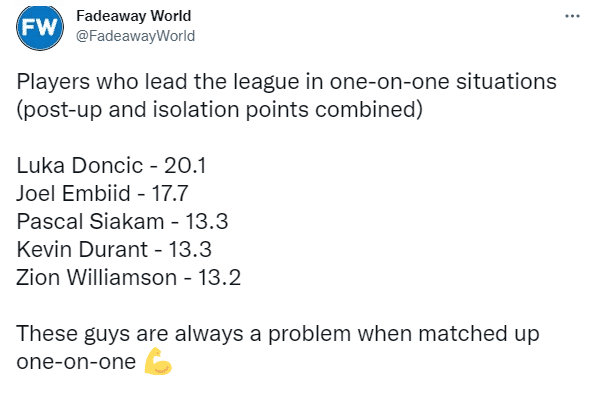 本赛季联盟球员单挑得分排名:东契奇场均20.1分联盟第一,恩比德场均17.7分排名第二,西亚卡姆和杜兰特都是场均13.3分,锡安场均13.2分。