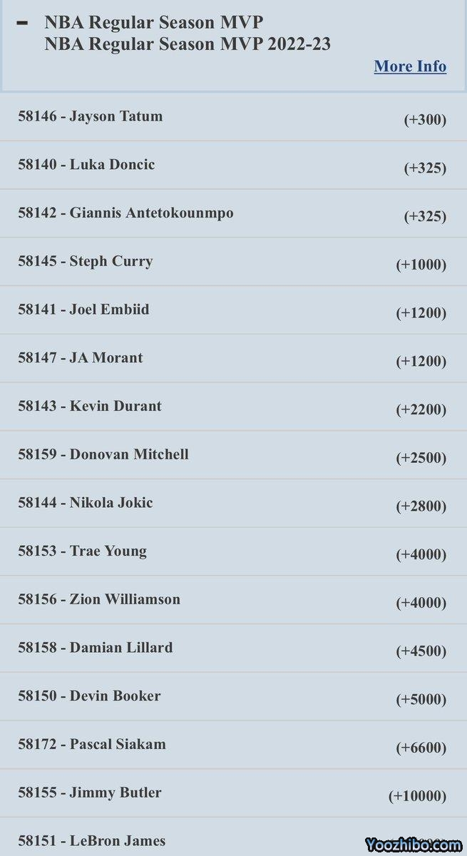 最新MVP赔率具体情况:塔图姆 +300、东契奇和字母哥 +315、库里 +1000、恩比德和莫兰特 +1200、杜兰特 +2200、米切尔 +2500、约基奇 +2800、特雷-杨和锡安+4000、利拉德 +4500、布克 +5000、西亚卡姆 +6600、巴特勒 +10000和詹姆斯 +15000。