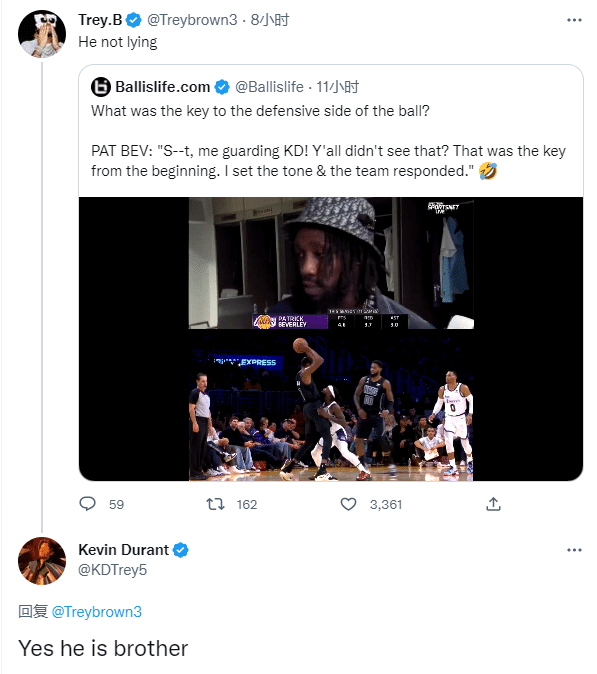 有球迷转发贝弗利的言论并且写道:他没骗人。对此杜兰特回应:兄弟,他有。