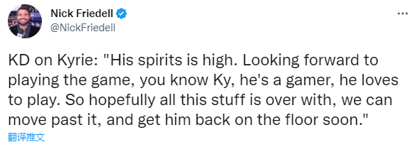 赛后谈到欧文的情况,杜兰特表示:我一直跟欧文保持着联系,他的精神状态很好,希望所有的事情全都结束,期待他重返赛场。