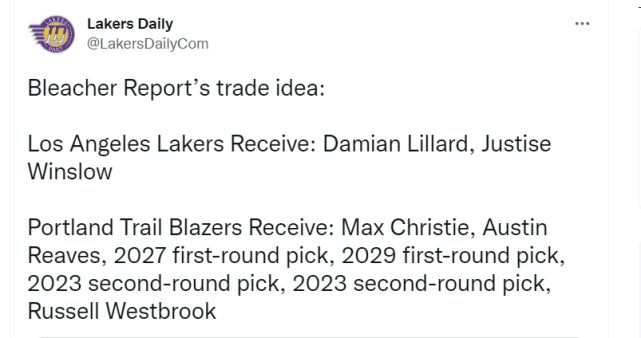 美媒Lakers Daily援引Bleacher Report的报道,晒出了一个疯狂的7换2方案。具体是湖人送出威少、克里斯蒂、里夫斯、2027年首轮、2029年首轮和两个2023年次轮,得到开拓者的利拉德和温斯洛。美媒想帮助湖人组詹姆斯+浓眉+利拉德的三巨头,问题是4胜0负的开拓者为什么要做这笔交易?虽然湖人两个首轮吸引力大,但开拓者势头正猛,应该不愿意重建。
