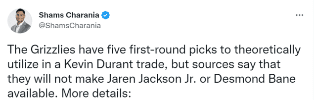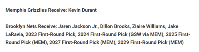 美媒曾为灰熊列出过一笔9换1的交易方案,灰熊送出小杰克逊、狄龙-布鲁克斯、扎伊尔-威廉姆斯、杰克-拉纳维亚、2023年首轮、2024年首轮(来自勇士)、2025年首轮、2027年首轮和2029年首轮,得到篮网的杜兰特。显然,代价是巨大的,而且还包括了灰熊不愿意送出的小杰克逊。