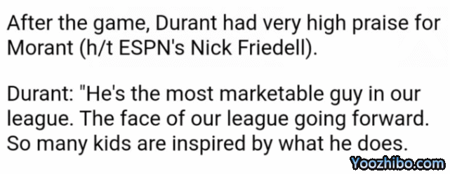 杜兰特本人也很欣赏莫兰特。对灰熊一战赛后,杜兰特曾如此评价莫兰特:“他是我们联盟最有市场的球员,是我们联盟继续前进的门面。太多孩子会因他受到鼓舞。”