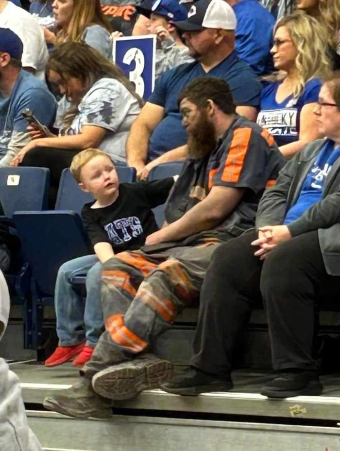 这是一张什么照片呢?照片中,一位中年的挖煤工人在下班后,没有来得及洗漱换掉工作服,就带着儿子来看肯塔基男篮的比赛。
