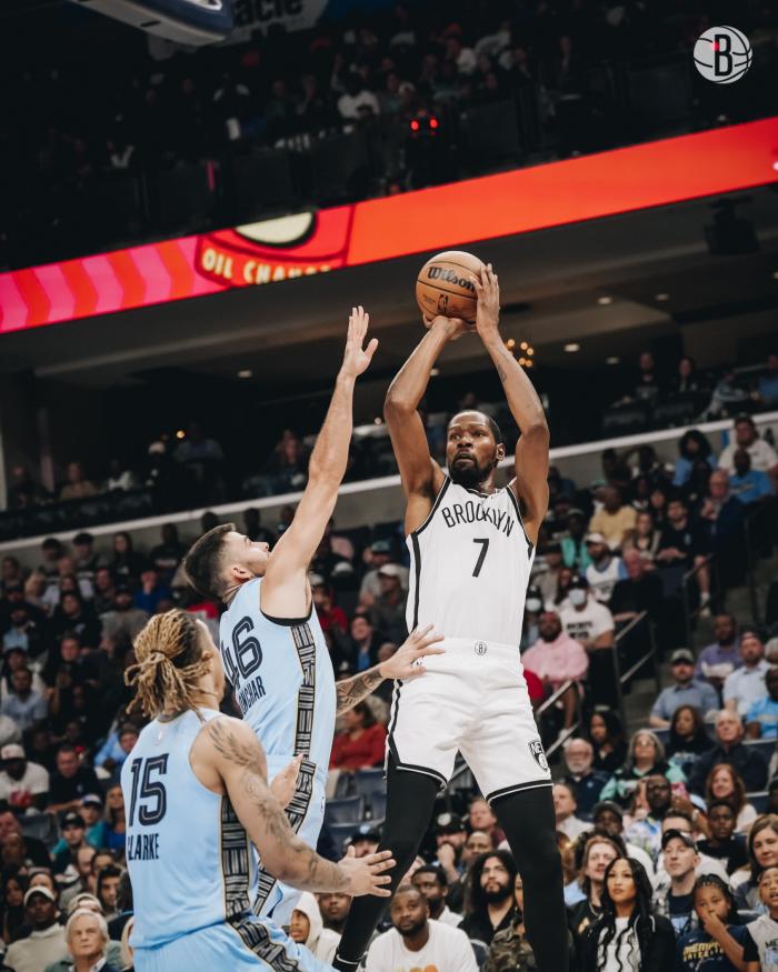下半场,杜兰特第三节开启杀神模式,单节8投7中独砍17分,一招急停中投真是稳准狠;可篮网被打爆了;灰熊第三节开场打出20-5的超级攻势从而夺回领先,第三节灰熊悍将贝恩火力全开,单节轰进4记三分,灰熊单节45-28净胜篮网17分,三节打完,篮网97-109落后12分。