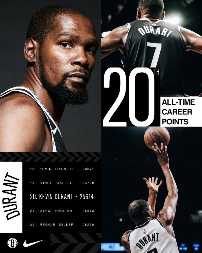 杜兰特遭遇里程悲,生涯常规赛总得分超越超过英格利什(25613分),上升至历史得分榜第20位,排在杜兰特前面的一位是文斯-卡特(25728分)。