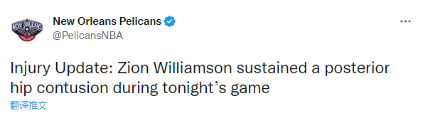 赛后鹈鹕主教练威利-格林透露没让锡安上场是伤病原因,鹈鹕官宣,锡安-威廉森伤情初步诊断为髋关节后部挫伤。