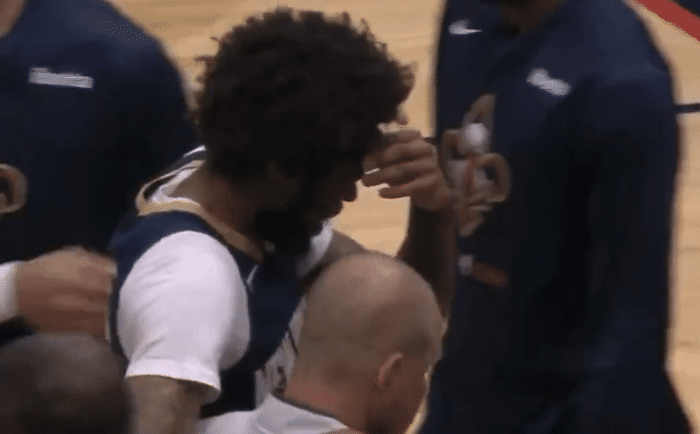 英格拉姆伤退后,锡安在末节遭遇伤病,大帽克拉克森后鹈鹕反击,锡安想要扣篮却被克拉克森大帽干扰,锡安失去平衡从空中重摔倒地,躺在地板上痛得乱打滚;之后锡安坐回替补席,末节关键时刻和加时赛,锡安都没有重返赛场。
