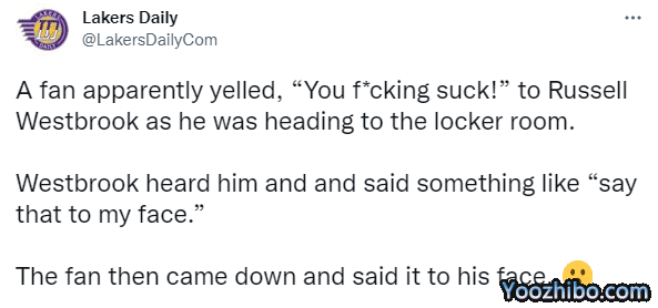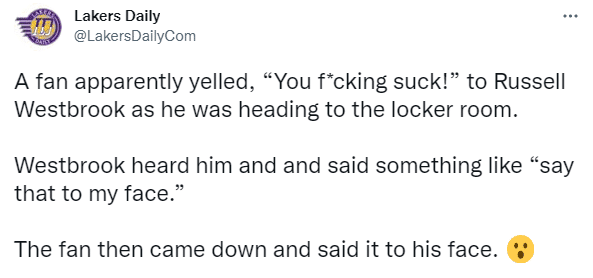 湖人媒体Lakers Daliy晒出威少被骂一幕,湖人输给快船赛后,当威少走在返回更衣室的通道时,有球迷对威少喊道:你TM太烂了!随后威少冲着球迷反问道:对着我的脸再说一次?”然后球迷对着威少又喊了一次。之后威少径直走回更衣室。