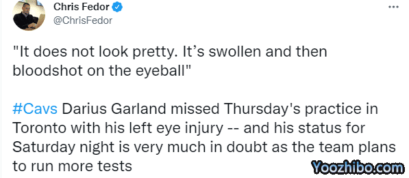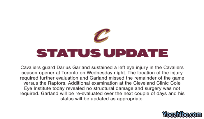 如今骑士官宣加兰的检查结果,左眼未骨折且无需手术,不过加兰仍旧因伤休战几天,据骑士记者Chris Fedor报道,加兰今日没有随队参与训练,他回到了酒店,加兰的眼睛肿了,眼球充满了血丝。