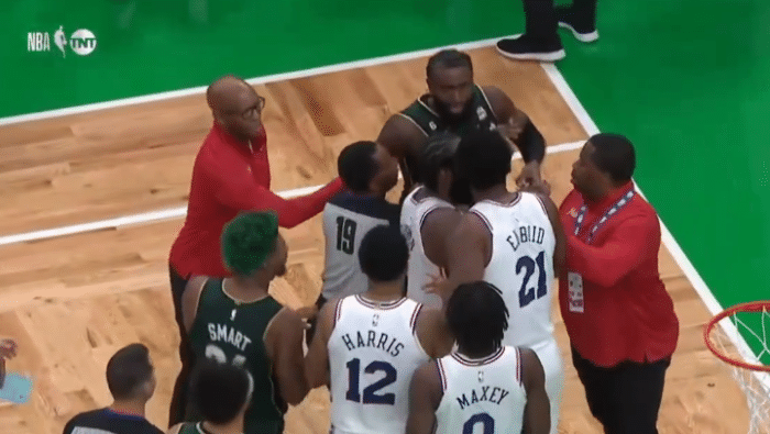 斯玛特报复拽倒恩比德引冲突 哈登第一时间劝架绿军球迷怒骂大帝