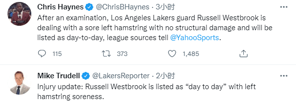 来源:24直播网10-17 14:4424直播网讯10月17日,湖人巨头威少的腿筋检查结果出炉,据名记Chris Haynes报道,威少的左腿筋无结构性损伤,仅仅只是左腿筋酸痛,进入每日观察名单;另外据报道,新赛季常规赛威少会继续替补。