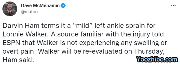 湖人和森林狼比赛第三节5分31秒,朗尼-沃克被倒地的贝弗利误伤,捂着膝盖十分痛苦,一瘸一拐离场,因伤退出比赛,初步确诊为左脚踝扭伤;赛后湖人主帅哈姆表示沃克的左脚踝遭遇轻度扭伤,明日球队会对其伤情进行再次评估,看看他的脚踝一夜后会有什么反应。