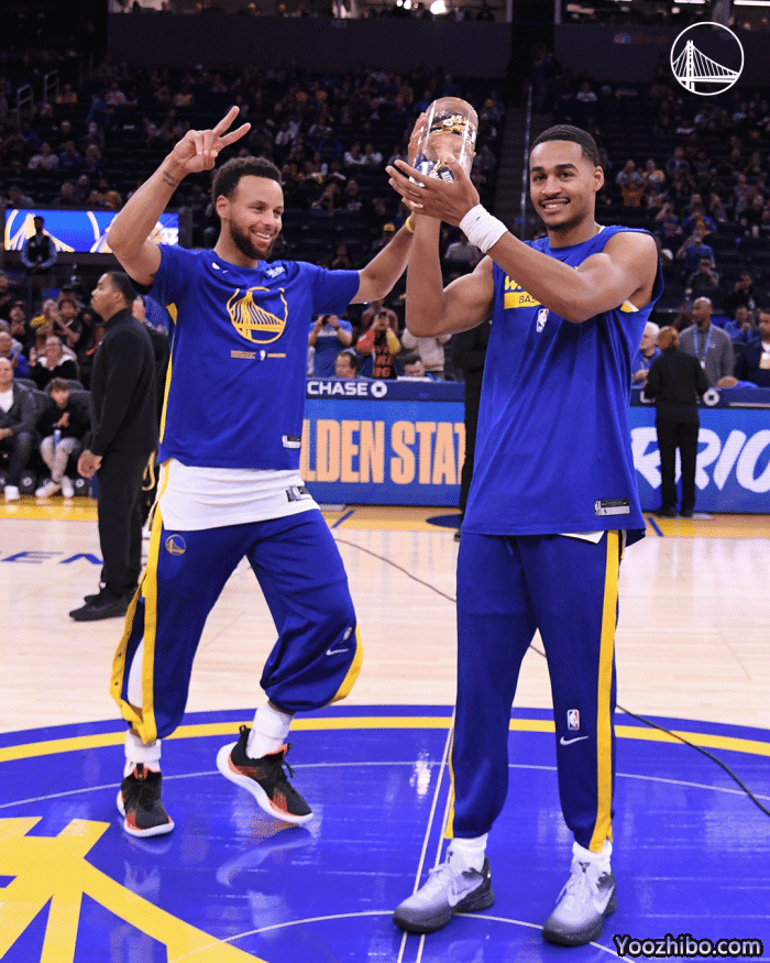 此前勇士在日本东京打了两场季前赛,如今勇士终于重返主场,对阵湖人赛前,库里当着勇士球迷的面为普尔颁发上赛季的罚球冠军奖杯,普尔高举奖杯庆祝,库里站在普尔身后比出一个“2”个手势,满脸笑容十分抢镜。