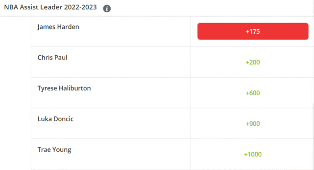 再来看看助攻王的赔率排名,前五依次是哈登(+175)、保罗(+200)、哈利伯顿(+600)、东契奇(+900)、特雷-杨(+1000)。生涯至今,哈登在2016-17赛季拿过一次助攻王,而他在76人的新角色是以组织为主,休赛期他成功减重并彻底康复,也让他被看好再次成为助攻王。保罗紧随其后,这位37岁的后卫是上赛季的助攻王,已有五个赛季领跑助攻榜。