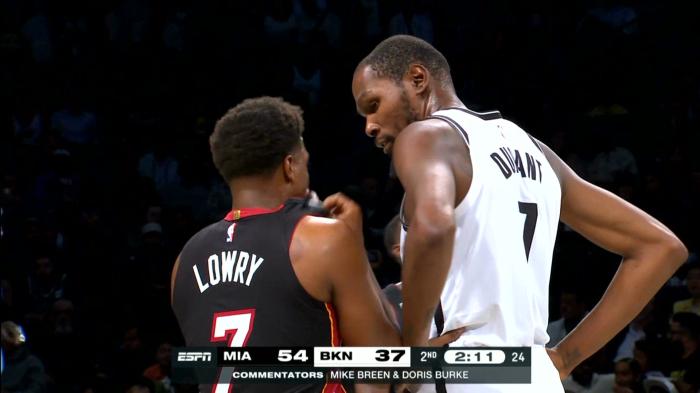 第二节,热火连中三分继续扩大分差,9分34秒,杜兰特重新上场,造犯规两罚全中,可热火火力太猛,热火又打出8-0攻势,篮网大比分落后,逼迫杜兰特挥舞死神镰刀,里突外投不断砍分,迎着防守强投摔倒造犯规,罚球时杜兰特和洛瑞交流一番。