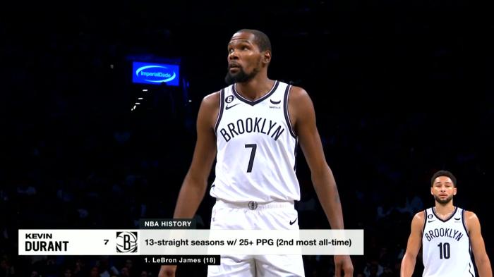 下半场,杜兰特和西蒙斯两大巨头继续带队,杜兰特外线三分打铁,防守端逼迫阿德巴约失误;杜兰特持球杀到禁区上篮,持球一挑二高难度出手打铁不中,之后奥尼尔空位三分不中,杜兰特高难度后仰跳投,杜兰特很强,但篮网一直落后,4分57秒篮网51-71落后20分,杜兰特终于下场休息。