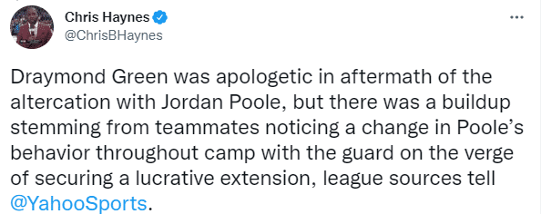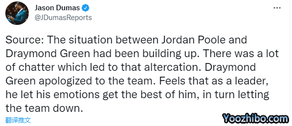 格林和冲突之后,勇士跟队记者Jason Dumas跟进报道说,乔丹-普尔和德雷蒙德-格林之间的关系一直在升温,有很多喋喋不休的争执导致了这场争吵。德雷蒙德-格林已经向球队道歉,他觉得自己作为球队领袖(之一),他让情绪战胜了自己,让球队失望了。