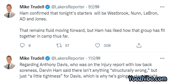 哈姆还表示:他们(詹姆斯、威少和浓眉)三人有出场时间限制,都会得到一些短暂的出场时间,计划全场使用11到12人轮换。