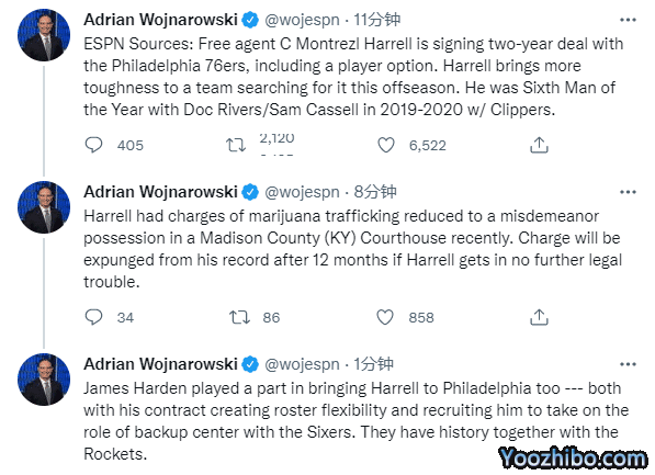 Woj还透露,詹姆斯-哈登在将哈雷尔带到费城的过程中也发挥了作用,哈登的合同创造了阵容灵活性,并招募哈雷尔在76人队担任替补中锋的角色。