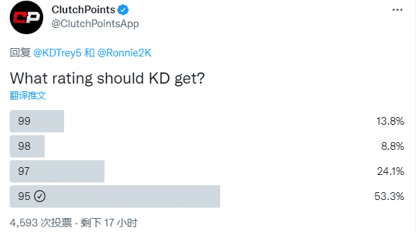 杜兰特不满能力值是96,美媒Clutcu Points发起关于杜兰特能力值该是多少的投票,目前4593人投票,53.3%的球迷觉得杜兰特能力值应该是95,24.1%的球迷觉得该是97、8.8%的球迷觉得该是98和13.8%的球迷支持杜兰特能力值该是99。