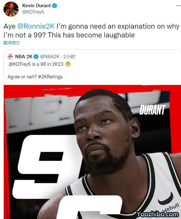 杜兰特转发2K官方公布其能力值为96的动态,发推@2K游戏负责人并且写道:诶诶,我需要一个解释,为什么我的2K评分不是99?这太可笑了。