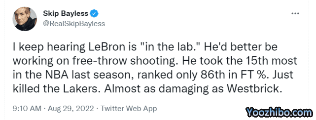 “我一直听说勒布朗在球场训练,他最好研究一下罚球。上赛季,他的罚球次数在联盟排名第15位,而罚球命中率却只排在第86位,这简直要杀了湖人,几乎和威铁(Westbrick,调侃威少的绰号)一样具有破坏性。”贝勒斯数据还不够准确,詹姆斯罚球次数其实排在第25位。