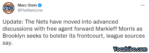 此前Marc Stein曾报道,篮网很有兴趣签下马基夫-莫里斯,不过76人也在探索签下这位费城本地人的可行性;76人有意抢人,篮网更进一步与大莫进行谈判;目前篮网新赛季大名单上有15名球员,杜兰特、欧文、乔-哈里斯、本-西蒙斯、克拉克斯顿、米尔斯、赛斯-库里、罗伊斯-奥尼尔、托马斯、沃伦、萨姆纳、夏普、爱德华兹、阿隆德-威廉姆斯(双向合同)以及渡边雄太。