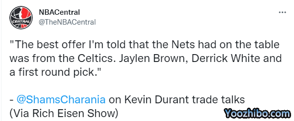 来源:24直播网08-25 11:0224直播网讯08月25日讯 ,杜兰特离队闹剧已经结束,新赛季他将继续带队冲击总冠军;杜兰特留守另一原因曝光,名记shams在节目中爆料,关于杜兰特的交易,篮网收到的最好报价来自凯尔特人,他们的报价是杰伦-布朗、德里克-怀特和一个首轮选秀权,试图3换1引援杜兰特。