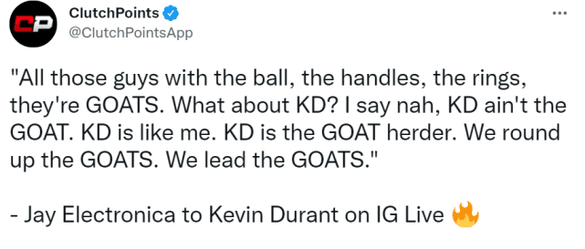 说唱歌手Jay Electronica和杜兰特连线,并说道:“KD(杜兰特)不是GOAT(山羊,指史上最佳),KD和我一样,是个牧羊人。我们可以聚拢那些山羊,我们是山羊的领袖。”听到这番话,杜兰特露出灿烂的笑容。看来,他对于“牧羊人”的称号很满意。