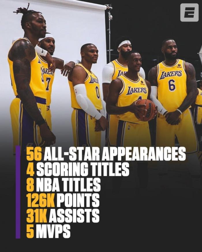 湖人的阵容可以说是流量最高的豪华阵容,除了年龄大一点真的没啥好说的!ESPN狂赞湖人“6大金刚”并统计了他们的荣誉,来证明他们阵容的豪华:合计56次全明星、4个得分王、8个冠军、126000的总得分、31000的总助攻数以及合计5个的MVP。