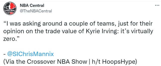 来源:24直播网09-30 11:1024直播网讯9月30日讯 ,据《体育画报》记者Chris Mannix的报道,凯里-欧文的交易价值基本是零。“我问了几支球队,就是看看他们认为欧文的交易价值有多少:基本上是零。他的新赛季薪水3500万美元,并且他非常难以捉摸。”