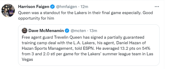 湖人记者哈里森-费根表示,奎恩在夏季联赛的最后一场比赛表现出色,对他来说,这是一个好机会。夏联收官战对阵勇士,奎恩替补出场不到18分钟,16投8中,得到21分5篮板4抢断。
