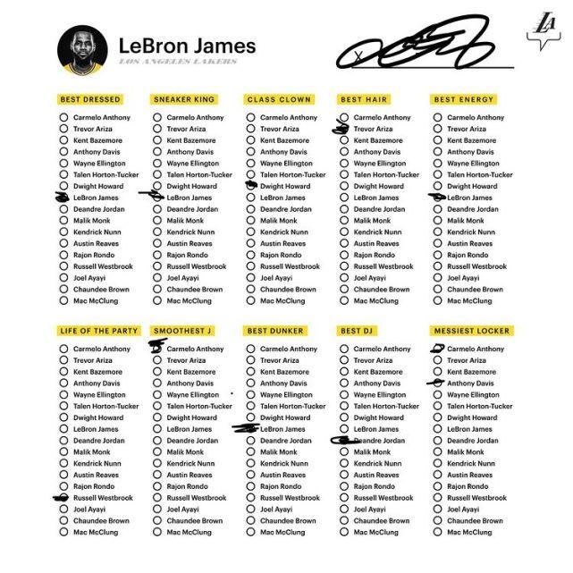 在最佳着装、鞋王、最佳能量、最佳扣将这4个奖项里,詹姆斯都投了自己一票。其余的奖项,耍宝王,他投给了霍华德;最佳发型,他投给了阿里扎;派对王,他投给了威少;最佳投手,他投给了安东尼;最佳DJ,他投给了小乔丹,而小乔丹英文姓名缩写也是DJ;最乱更衣柜,他选了两个人:安东尼和浓眉。