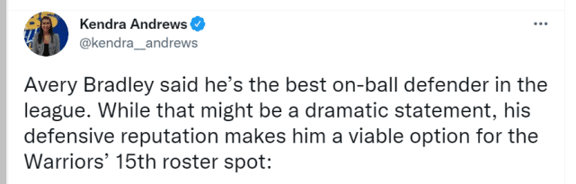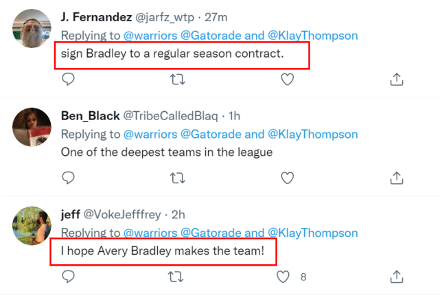 近日,布拉德利和勇士签下一份训练营合同,竞争队内的第15人位置。勇士当地媒体和球迷都希望布拉德利能够最终留队。不少球迷在勇士官方社媒下留言,希望球队给布拉德利一份正式合同,而NBC体育也建议勇士留下布拉德利,并认为他是汤普森12月初正式复出前的最佳选择。