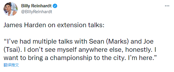 谈到提前续约的话题,哈登表示:我和马克斯、蔡老板进行了多次会谈。我没有设想过自己会去篮网之外的任何地方,我想为这座城市带来一座总冠军奖杯。我的心在这里。