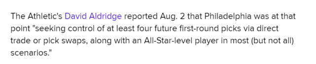 NBA记者大卫-阿尔德里奇曾在8月初报道称,76人寻求的西蒙斯交易回报是至少4个未来的首轮签或者互换权,再加上一个全明星级别的球星。现在看来,很难有球队提供如此高的报价。