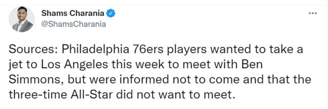 “多位消息人士称,出于礼貌,西蒙斯不希望他的队友(其中包括一些他的好友)在费城和洛杉矶之间来回通勤,因为这不会改变他想要通过交易离队的想法。”查拉尼亚在报道中写道。