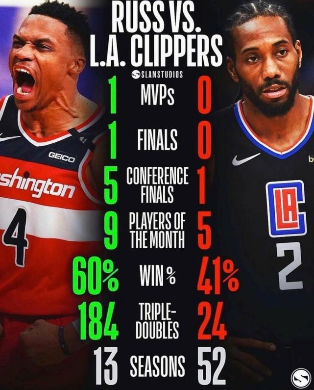 图中显示,威少拿到1个常规赛MVP,打进1次总决赛,5次打进分区决赛,9次夺得月最佳球员,个人胜率60%,拿到184次三双。相比之下,快船52年队史没有球员拿到常规赛MVP,球队没有打进过总决赛,只打进过1次分区决赛(上赛季),队史上球员总计只拿到5次月最佳,球队胜率41%,所有球员的三双次数加在一起只有24次。