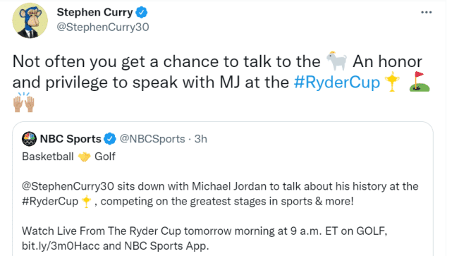 和库里一样,乔丹也是一位高尔夫球爱好者,时不时在篮球场外露一手。画面上,乔丹和库里在高尔夫球场上面对面交流。这是在威斯康星州的呼啸峡谷举行的莱德杯高尔夫球对抗赛,库里和乔丹都参与其中,并有所交流。