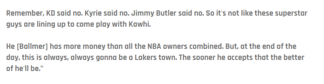 1000亿也买不到总冠军!名嘴回应快船老板:洛杉矶永远是湖人的城市
